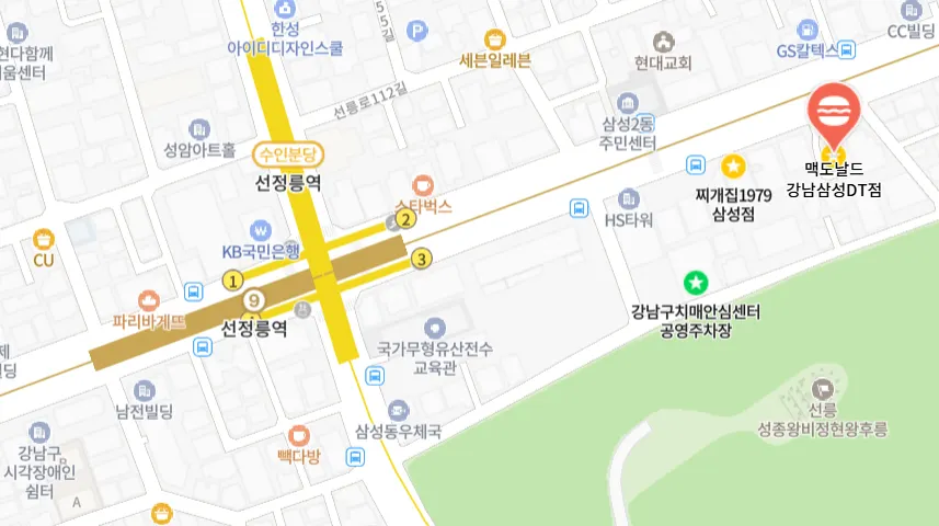 맥도날드 강남삼성DT점, 9호선 선정릉역 3번출구에서 300미터 직진